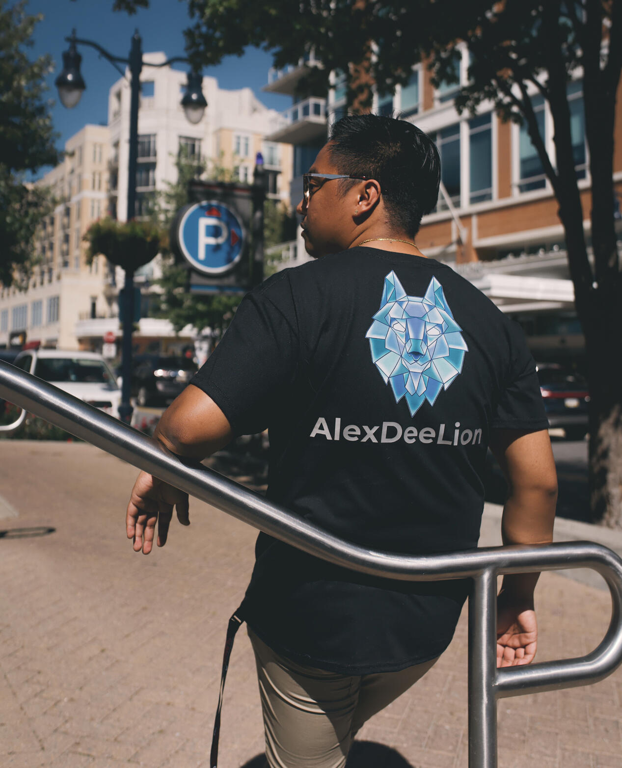 AlexDeeLion is 5’10 with our Crystal Wolf T-shirt in a Size Large